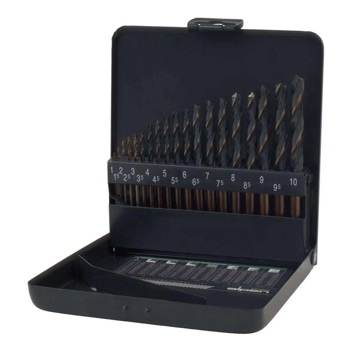 1-10mm 19pc HSS black bit set metal case: A set of 19 high-speed steel (HSS) drill bits with a black oxide finish, ranging in size from 1mm to 10mm, stored in a metal case.