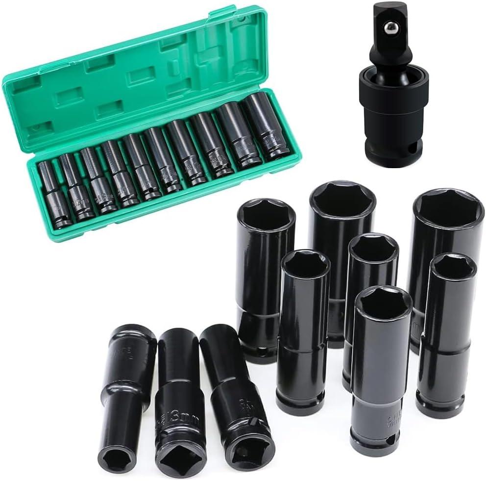 1/2" 10-24mm long impact bit set: A set of impact-rated socket bits with a 1/2 inch drive, ranging in size from 10mm to 24mm, with a long length.