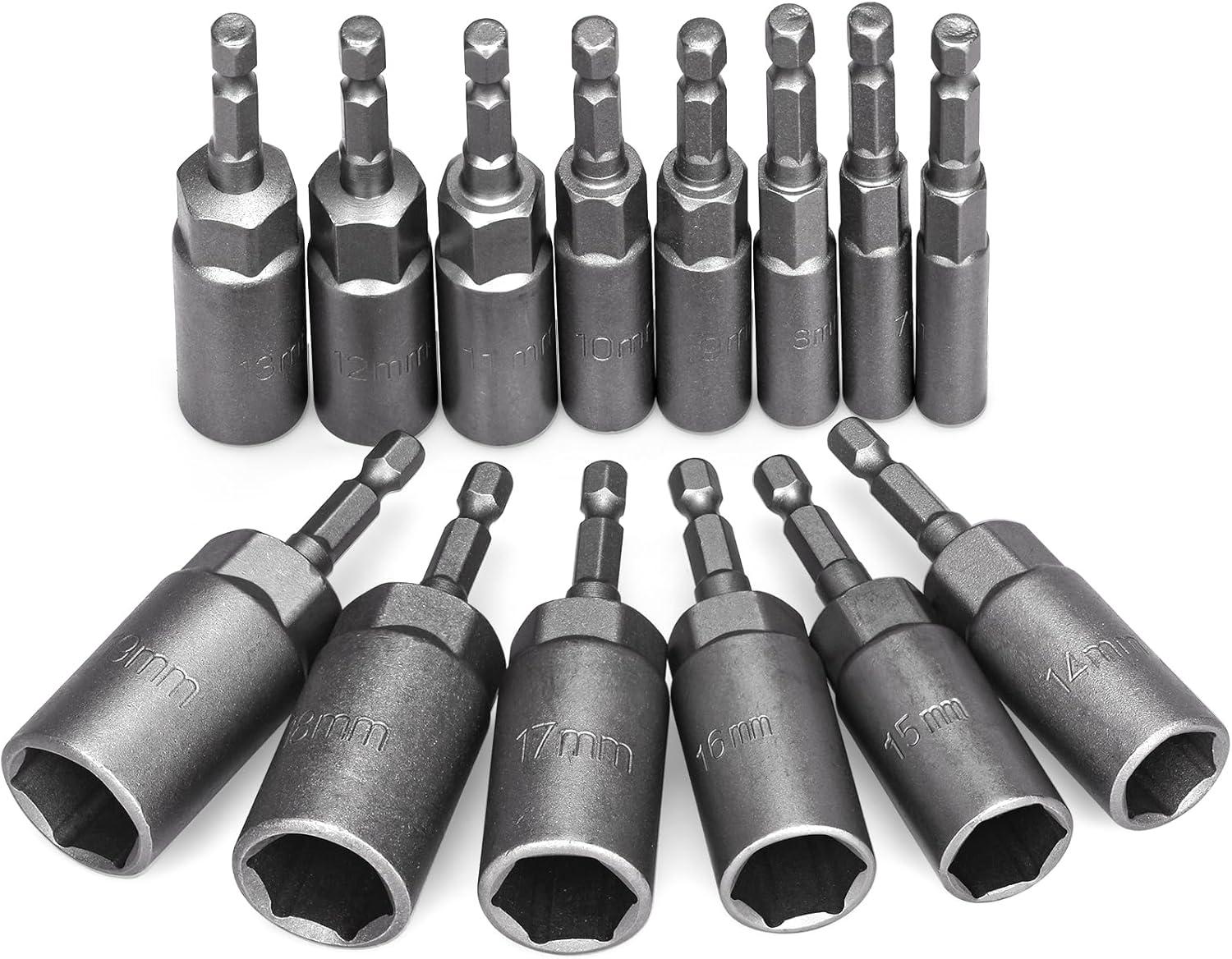1/4" 14pc system bit + 4-14mm adapter: A set containing 14 screwdriver or socket bits with a 1/4 inch shank, and an adapter for 4-14mm sockets.