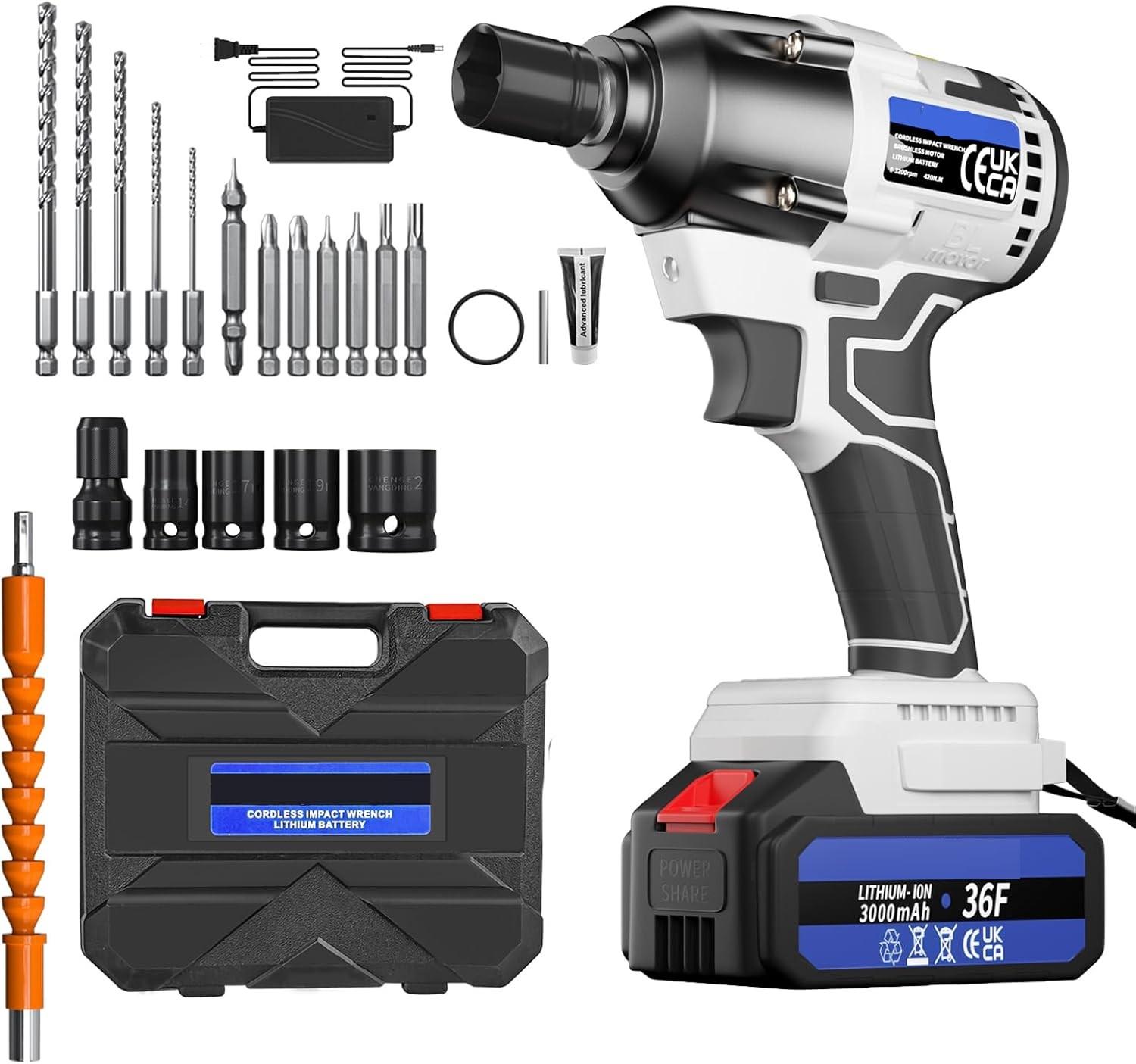 340W 1/2" impact wrench with bits: A power wrench that delivers high torque in short bursts (impact), 340W motor, 1/2 inch drive size, and including a set of socket bits.