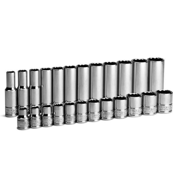 3/8" 12pc system bit + 8-19mm adapter: A set containing 12 screwdriver or socket bits with a 3/8 inch shank, and an adapter for 8-19mm sockets.
