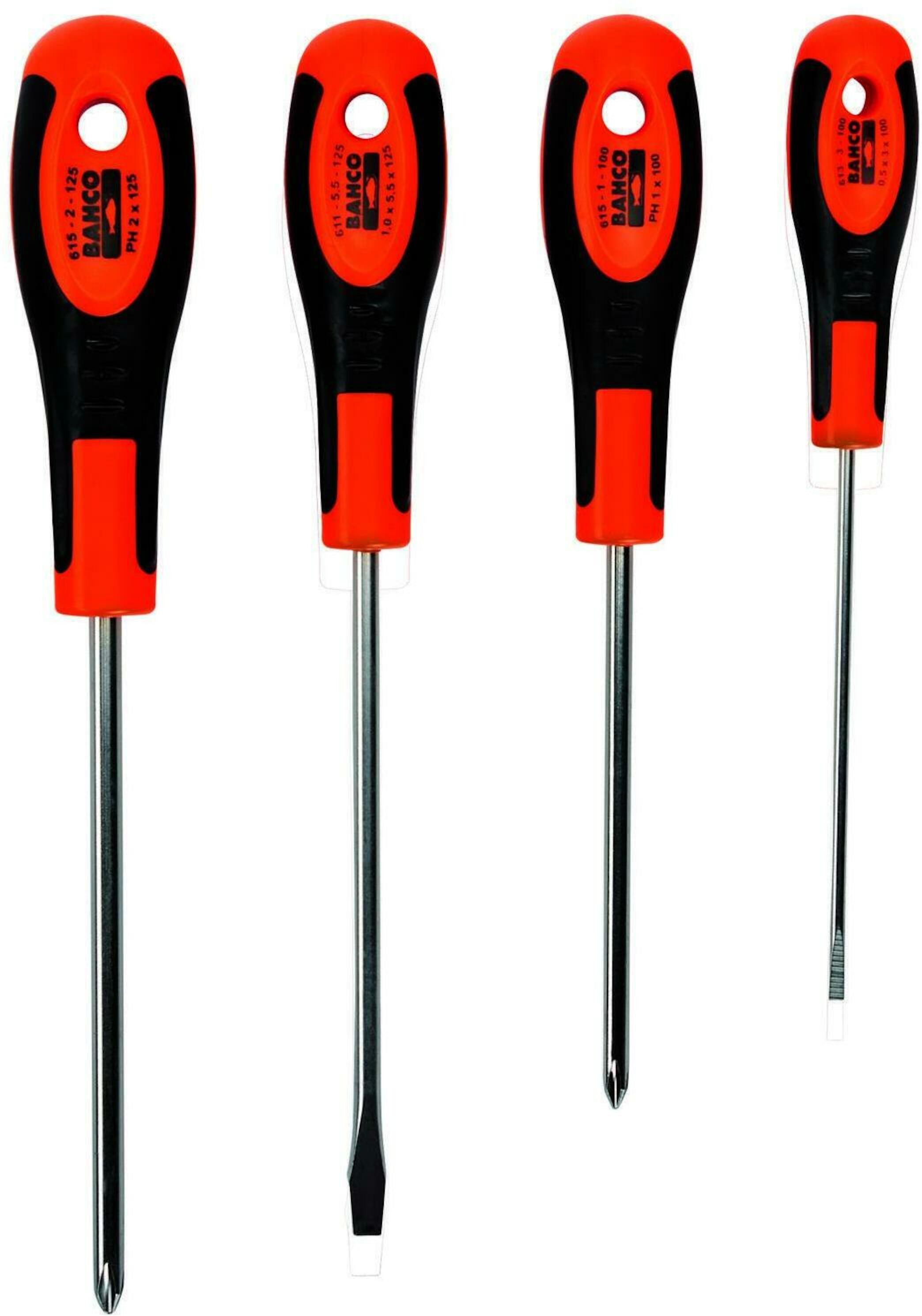 4pc Phillips/flat rubber-handle screwdrivers: A set of four screwdrivers, a mix of Phillips head and flathead, with rubber handles.