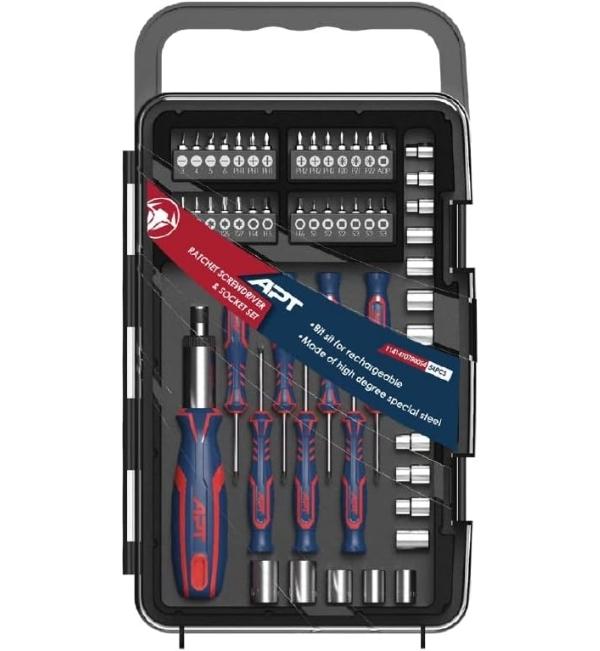 54-piece screwdrivers and notches set APT: A comprehensive set from APT containing 54 pieces, including screwdrivers and possibly nut drivers or bits (notches).