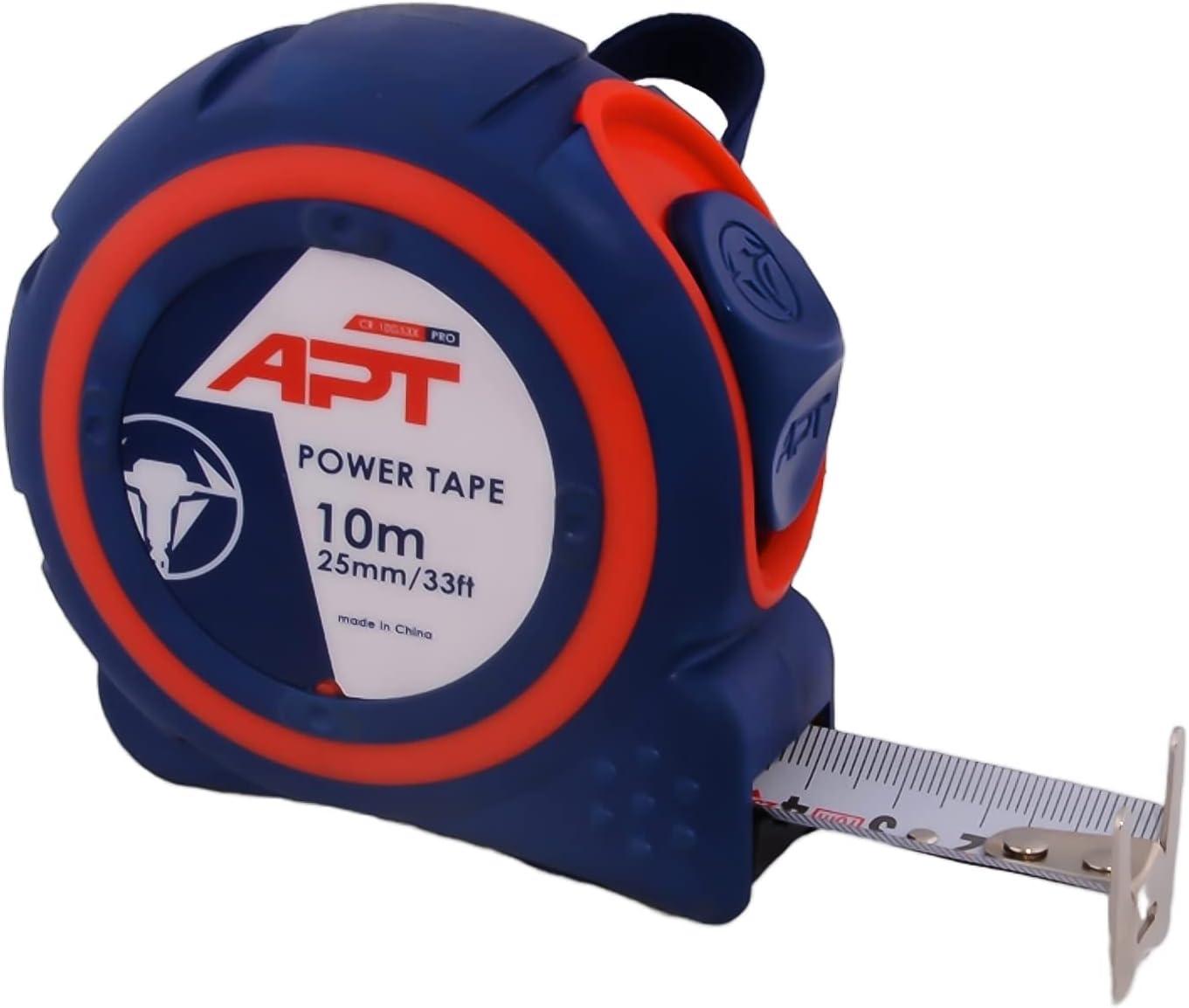 APT 10m 2-way tape measure: A measuring tape from APT, 10 meters long, with markings for measuring in two directions.